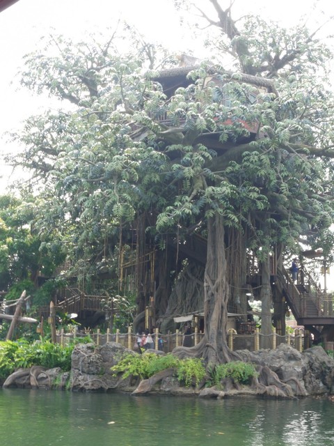 心滿意足拍完照後,接下來往「探險世界走去」,參觀位於河中央的「泰山小屋」,要前往樹屋,必須乘坐木筏才可到達。